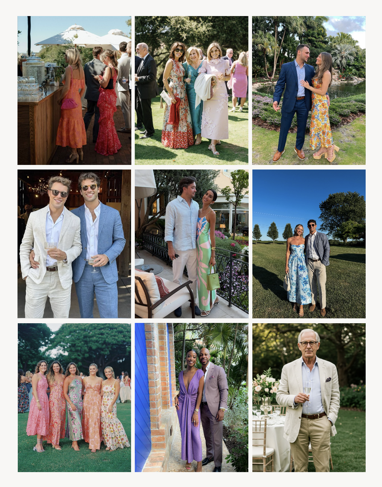Think summer garden party meets cocktail hour. Bright colours, florals, pastels, linen suits, chinos…all welcome.